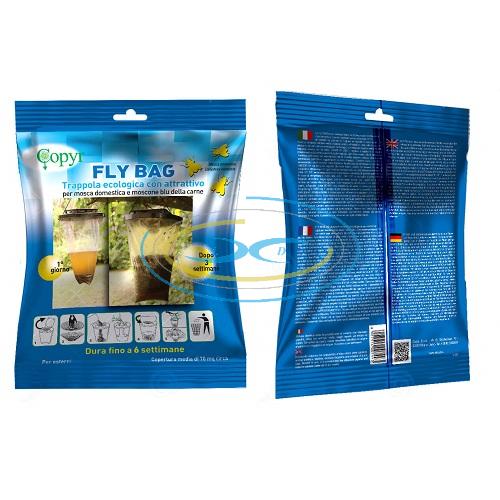 Questa trappola ecologica è indicata per il monitoraggio di mosca domestica e moscone blu della carne. FLY BAG è un sistema facile ed ecologico (privo di insetticidi) per il monitoraggio delle mosche. Le mosche sono invitate ad entrare nella trappola e una volta entrate non hanno possibilità di uscita. Il monitoraggio è attivo quasi da subito e se il ritrovamento della mosche all'interno della trappola risulta elevato, si rende necessario porre ulteriori interventi. Può essere utilizzata in spazi aperti ed in ambienti chiusi come ad esempio le stalle.